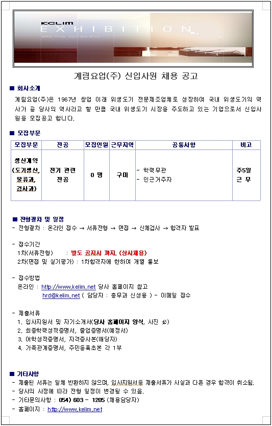 생산 계약직(도기생산,물류과,검사과) 신입사원 채용공고