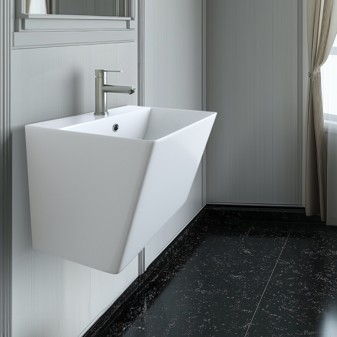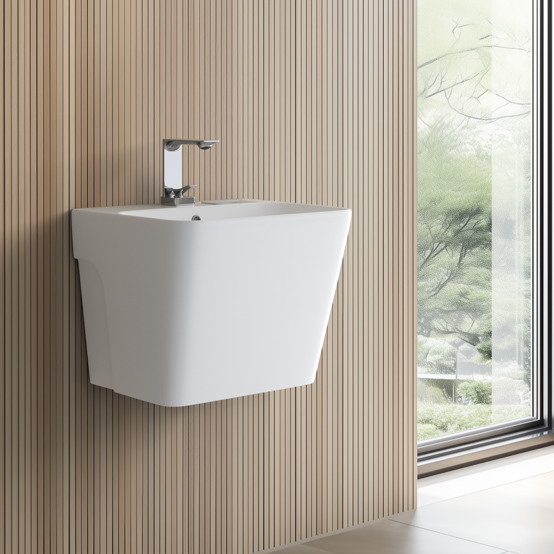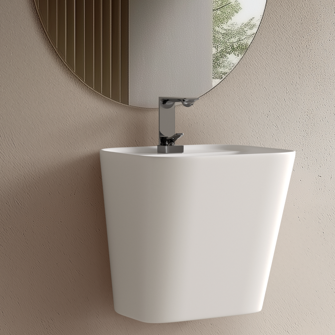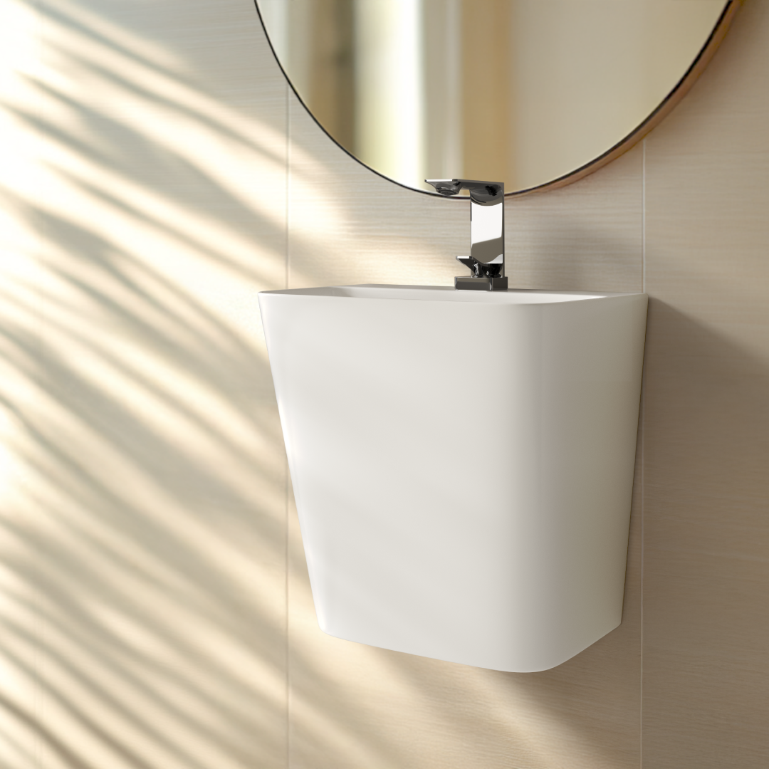 직선적인 형태와 넓은 사각 구조가 특징인 페데스탈 일체형 세면기