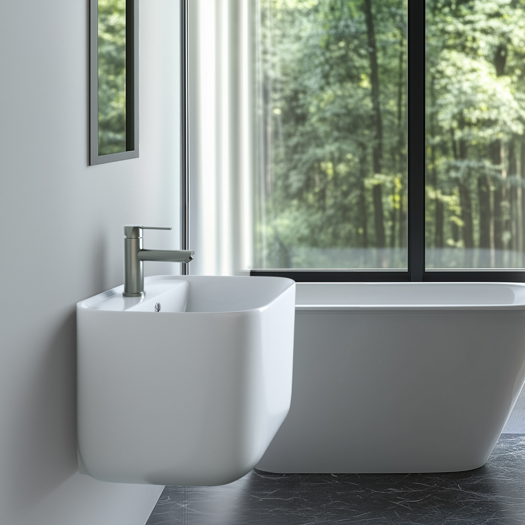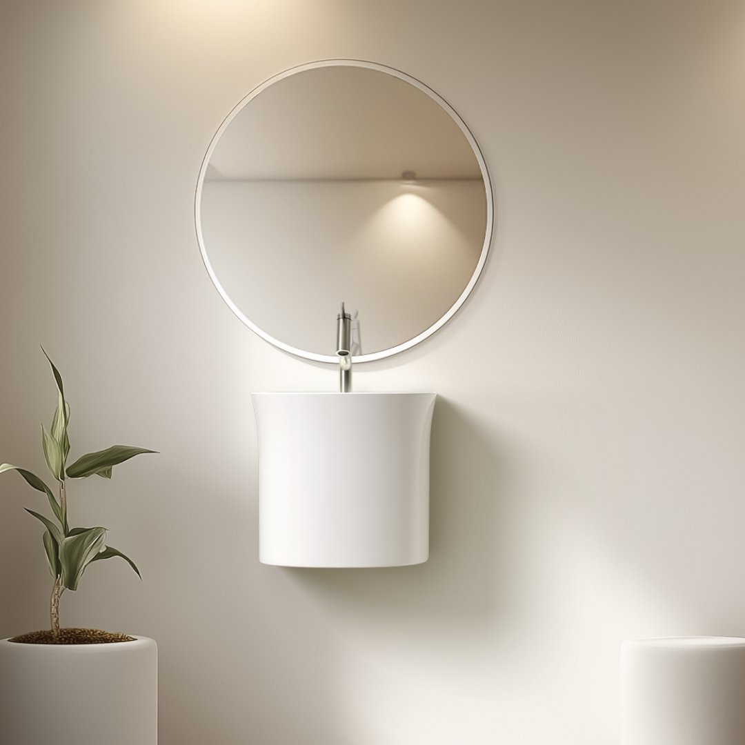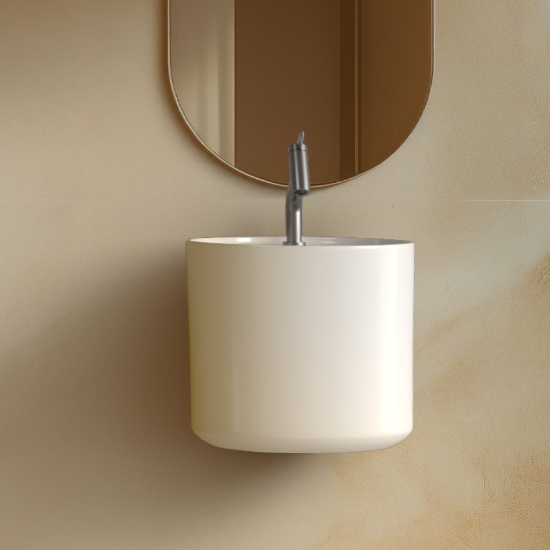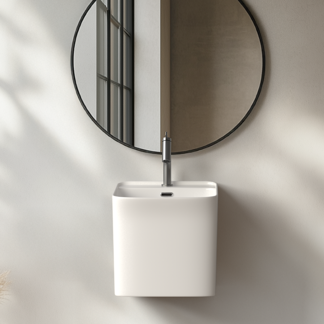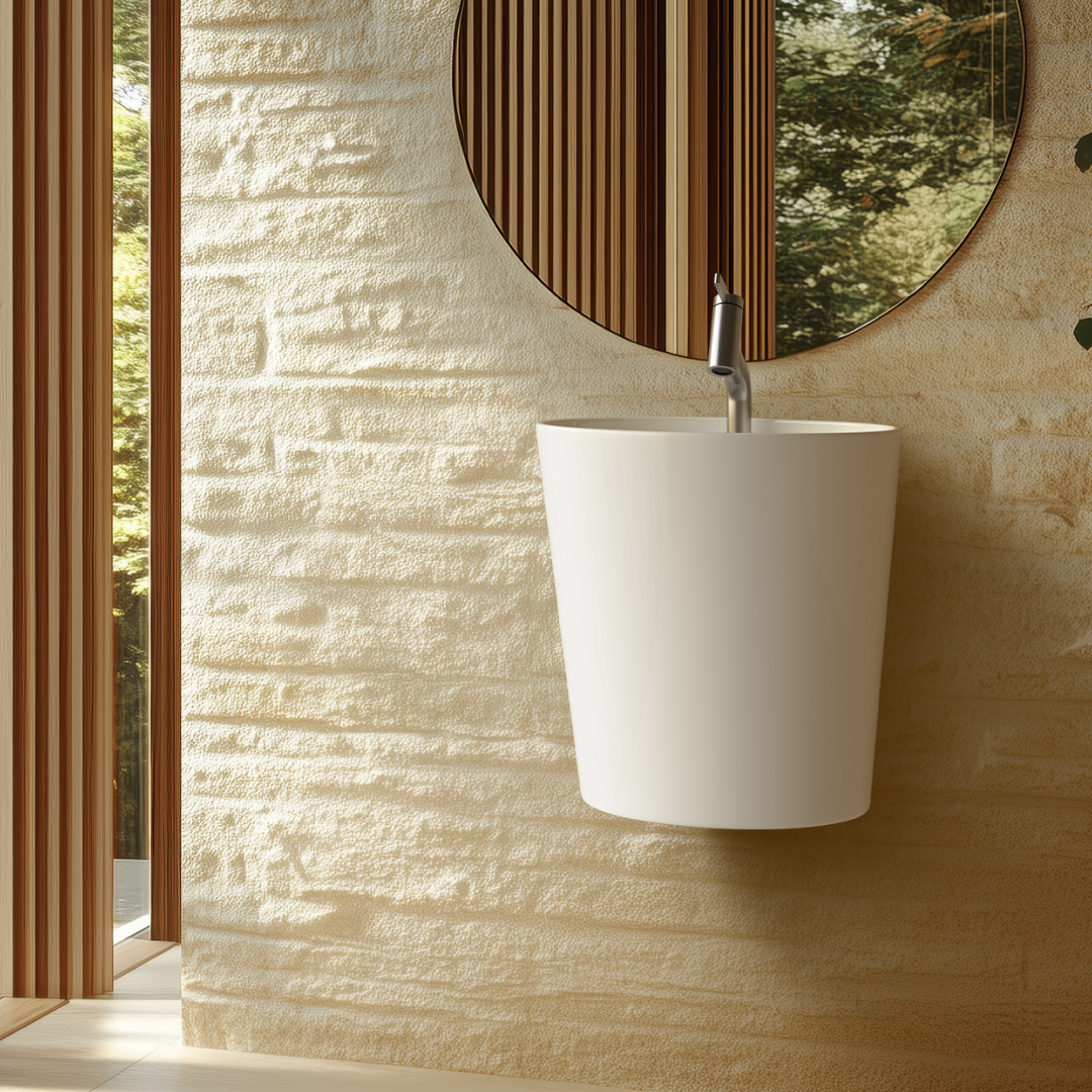 직선적인 형태와 넓은 사각 구조가 특징인 페데스탈 일체형 세면기